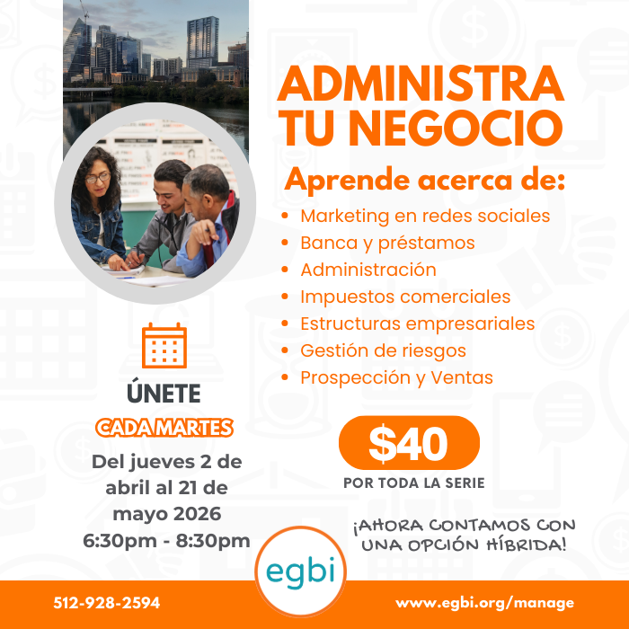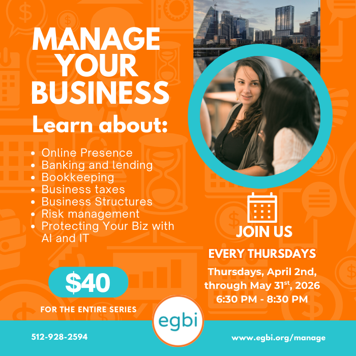 EGBI Business Accelerator Upcoming Events Lunch & Learn: Employee vs Contractor: What Business Owners Need to Know April 22, 2026, 11:30 am Understand employee vs. independent contractor classification, when and how to categorize, and protect your business from costly mistakes.Read More » Register » Childcare Biz Profitability Bootcamp April 25, 2026, 9:00 am A 1- day workshop for people with licensed and operating in-home daycares to build a plan and grow their business.Read More » Register » Bootcamp de Rentabilidad en Negocios de Cuidado Infantil April 25, 2026, 9:00 am La información compartida está diseñada para personas con guarderías en casa con licencia y en funcionamiento.Read More » Register » Show Me the Money – Funding Strategies for Business Owners May 4, 2026, 11:30 am Funding your business starts here—learn real strategies, hear from experts, and get the tools to grow with confidence.Read More » Register » Taxes Made Simple: Less Stress, More Savings May 5, 2026, 6:30 pm Learn business taxes, IRS forms, sales tax, and payroll basics to stay compliant and manage your finances confidently.Read More » Register » BACK TO TOP Contact Us Phone: (512)928-2594 Email: hello@egbi.org Address: 1144 Airport Blvd. Suite 260, Austin, Texas 78702 Terms of Service Social Media Facebook Instagram LinkedIn YouTube SUBSCRIBE TO OUR NEWS! * indicates required First Name (Nombre) Last Name (Apellido) Email Address *Preferred Language (Idioma Preferido)